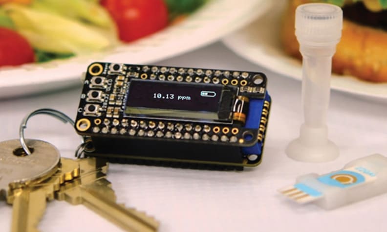 The device consists of three components. A small plastic test tube is used to dissolve a sample of the food being tested and to add it to the magnetic beads that capture the food allergen of interest, such as gluten. A bit of that solution is dropped onto electrode strips in a small module that is then inserted into the electronic keychain reader. The reader has a display that indicates whether the allergen is present, and if so, in what concentration.