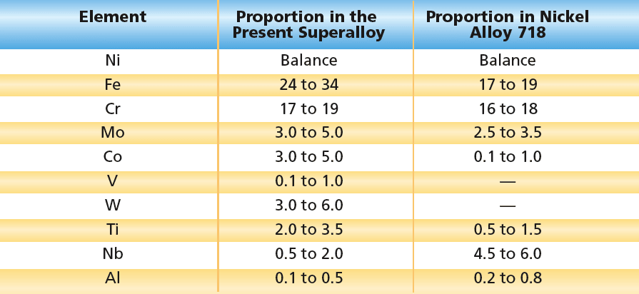 The most novel property of this alloy is that it resists embrittlement by hydrogen while retaining tensile strength >175 kpsi (>1.2 GPa). This alloy exhibits a tensile elongation of more than 20 percent in hydrogen at a pressure of 5 kpsi (≈34 MPa) without loss of ductility. This amount of elongation corresponds to 50 percent more ductility than that exhibited by nickel alloy 718 under the same test conditions.