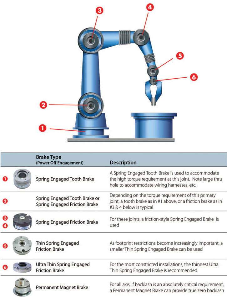 Resolution — Robotic applications focus on highly controlled motion, so resolution should always be taken into account. Both spring-engaged friction brakes and permanent-magnet friction brakes offer infinite resolution. The resolution of tooth brakes is limited by tooth-to-tooth angle and the number of teeth per revolution.