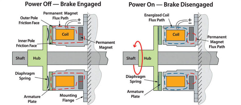 A third type of brake commonly used in robotics is the permanent-magnet friction brake. This type consists of a permanent magnet, field coil, armature plate, and hub. When power is off, the permanent magnet pulls the armature into contact with the friction faces, holding the shaft, hub, and load in place (Figure 4). When power is applied, the field coil generates a magnetic field of opposite polarity to that of the permanent magnet, which brings the force at the face of the armature to zero. The armature disengages from the electromagnet housing, assisted by a diaphragm spring.