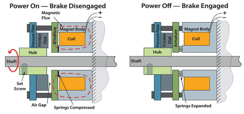 The key elements of a spring-engaged friction brake are the field coil, which is fixed to the machine frame or a backstop; the armature; the friction disk; and the pressure plate (Figure 1). Brakes of this type are typically, but not always coupled to the shaft with a hub, which is fixed to the shaft with a set screw. In the power on condition, the field coil generates an electromagnetic field that attracts the armature, compressing the springs and opening up an air gap between the armature and the friction disk. This allows the friction disk to rotate freely with the hub, shaft, and load.