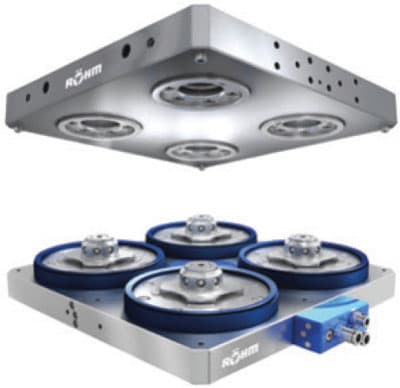 RÖHM Products of America (Suwanee, GA) offers the Power-Grip Zero Point Clamping System, and RZM and RKE vises. The clamping system delivers both palletizing and clamping capabilities with one device and in single setups. The modular palletizing system is customizable, and workpieces can be positioned and clamped on the pallet outside the machine tool while it continues to work. The RZM Centric Vise features clamping jaws positioned relatively high, and a horizontal spindle situated at the top of the vise and closer to the jaws. The jaws are shorter and complement the vise’s overall height of 7.7" to reduce interference. The RKE NC-Compact Vise clamping system optimizes CNC machining centers. Featuring a solid steel body with its contact surfaces and guides hardened and ground on all sides, the vise offers chip discharge with fewer interfering contours. Protective caps and dirt protectors prevent chips from penetrating the inside of the vise body.
