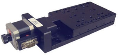 Optimal Engineering Systems (Van Nuys, CA) offers the AQ110 Series of low-profile, motorized, single-axis positioning stages. The four cross-roller linear stages have travel lengths of 15 mm (0.590"), 30 mm (1.181"), 50 mm (1.968"), and 75 mm (2.952"). Open-loop repeatability of all stages is 0.5μ using a 10-microstepsper-step motor driver, or just 0.25μ using a 20-microsteps-per-step motor driver. Precision-ground lead screws with 2μ of backlash and cross-roller linear travel guides provide repeatability of 5μ and positional accuracy of 10μ. Each table has a pattern of 16 threaded mounting holes for the addition of custom tooling, and the base has drilled and countersunk holes for integration into new and existing applications. Options include servomotors, encoders, limit switches, and fully compatible multi-axis motion controllers.