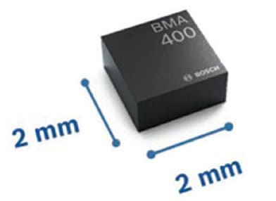 Bosch Sensortec (Stuttgart, Germany) released the BMA400 ultra-low-power acceleration sensor for wearables and Internet of Things (IoT) applications. Due to continuous measurement, the sensor’s measurement signal has defined cutoff frequencies, making it resistant to vibrations. With an ultra-low current step counter at 4 μA and power management features such as built-in activity recognition, the sensor can be used in wearable devices. The sensor wakes up automatically only when it detects motion and goes back into sleep mode when the motion recedes. It measures 2.0 x 2.0 x 0.95 mm³ and features an integrated plug-and-play step counter. It offers current consumption of 14 A at highest performance, continuous measurement, and a noise density of 220 g/√Hz; this falls to 1 A and below in the ultra-low-power self-wakeup mode.