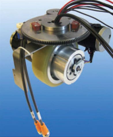 Allied Motion Technologies (Amherst, NY) introduced WheelMax™ Steering Series wheel drive assemblies that are fully integrated, electrically powered traction wheels with onboard steering systems for electric vehicles. The drives combine a traction wheel with tire, epicyclic gearbox, steering gear, and bearing system, and two PMDC brush motors — one for traction and one for steering power. Applications include AGVs, autonomous robotic material handlers, pushers and tuggers, powered utility carts, and hospital patient handlers. The drives handle loads up to 227 kg (500 lb.) and provide 14 Nm (120 lb-in) continuous torque at speeds of up to 5 km/hr (3 mph). The traction motor is equipped standard with a holding brake and an incremental encoder. Options include models compatible with 48 VDC power source instead of 24 VDC, brushless motor (with/without integrated drive electronics) for traction and/or steering power, flexible wiring for high cycle rotation, and manual-release holding brake.