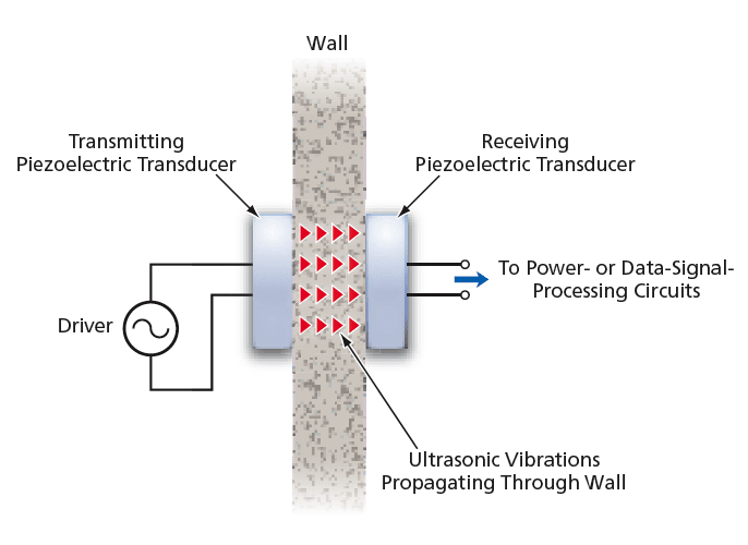 A method denoted wireless acoustic- electric feedthrough (WAEF) has been conceived for transmitting power and/or data signals through walls or other solid objects made of a variety of elastic materials that could be electrically conductive or nonconductive. WAEF would make it unnecessary to use wires, optical fibers, tubes, or other discrete wall-penetrating signal-transmitting components, thereby eliminating the potential for structural weakening or leakage at such penetrations. Avoidance of such penetrations could be essential in some applications in which maintenance of pressure, vacuum, or chemical or biological isolation is required.
