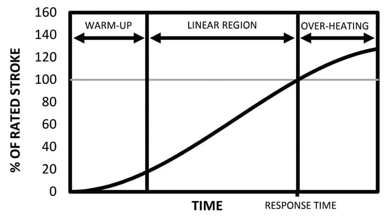Through experimentation and application trials, SMA-based actuators have demonstrated exceptional positional accuracy and precision. When operated in its linear region, the actuator responds to modulating power in a smooth and highly predictable manner. Because the actuator acts as a resistive load, complex communication or control techniques are generally not needed; in most cases, a simple PI control loop can be applied. When controlled using pulse width modulation, a low sub-kilohertz frequency can maintain repeatable accuracy and precision to within 5 μm (0.0002 in.).