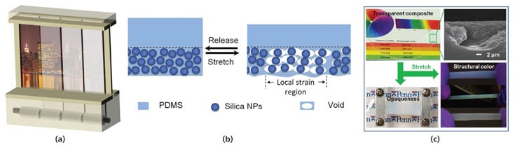 The film is highly transparent (>90% transmittance in the visible wavelength) in the initial state. Upon mechanical stretching, the transmittance is dramatically reduced to 30%, and displays angle-independent structural color at a strain >30%. The displayed reflective color is a structural color that could be tuned by the silica NP size; the color displayed is invariant with the applied strain.