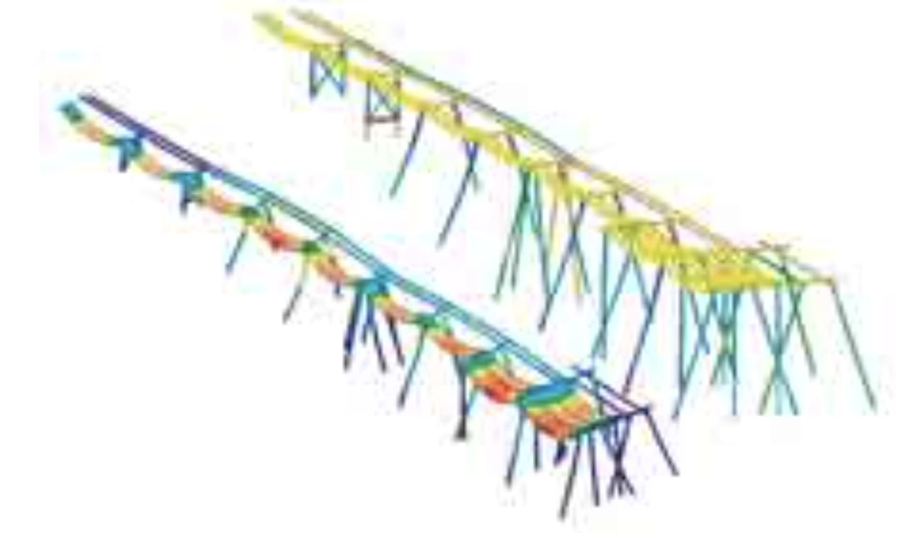 The engineers used the Superdraw 2- and 3-D sketching, modeling, and meshing tools within ALGOR FEMPRO to draw the various parts of the structure. The trestle consisted of headstocks, girders, walls, pipes, piles, and pile braces, all consisting of beam and plate elements with material properties of reinforced concrete for the headstocks, prestressed girders for the roadway, and structural steel pipes for the piles. The piles, aligned in a series of 'pile bents,' or rows of capped piles, support the roadway plates on which the vehicles travel.