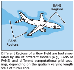 , where Δ is the cell width along one of the three spatial coordinate axes. During the second stage, one solves the applicable PANS equations for the case in which λ is fixed in time but allowed to vary in space. The use of λ plus other criteria too complex to describe here makes it possible to determine appropriate spatial resolutions for different regions of the flow (see figure). One can quickly determine whether the grid spacing is appropriate for the resolution needed to simulate the flow by use of PANS or another hybrid model.