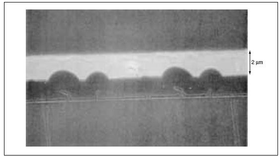 Trilayers of titanium, platinum, and gold are deposited by evaporation on the front side of the CCD and on the mating surface of the matched silicon substrate, in preparation for joining the CCD to the substrate by gold-gold thermocompression bonding. The platinum layers act as barriers to the diffusion of gold into the CCD (necessary because contamination by gold would degrade the performance of the CCD). The titanium layer increases the adhesion of the platinum layer to a protective oxide layer on the CCD. The gold layers on the CCD and the substrate are 1 µm thick. Thermocompression bonding of the CCD and the silicon substrate is performed by heating the assembly to a temperature of 400 °C in a vacuum at a clamping pressure of 10 MPa for 30 minutes. The total gold thickness of 2 µm is sufficient to fill the empty spaces between the CCD pixels and the silicon substrate (see figure).