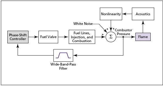 In this method (see figure), the output of a combustion-pressure sensor would be wide-band-pass filtered and then further processed to generate a control signal that would be applied to a fast-actuation valve to modulate the flow of fuel. Initially, the controller would rapidly take large phase steps in order to home in, within a fraction of a second, to a favorable phase region within which the instability would be reduced. Then the controller would restrict itself to operate within this phase region and would further restrict itself to operate within a region of stability, as long as the power in the instability signal was decreasing.
