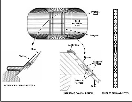 Figure 2 depicts selected aspects of the design of a vessel of this type with a toroidal configuration. The bladder serves as an impermeable layer to keep air within the pressure vessel and, for this purpose, is sealed to the central structural core. The web includes longitudinal and circumferential straps. To help maintain the proper shape upon inflation after storage, longitudinal and circumferential straps are indexed together at several of their intersections. Because the web is not required to provide a pressure seal and the bladder is not required to sustain structural loads, the bladder and the web can be optimized for their respective functions. Thus, the bladder can be sealed directly to the rigid core without having to include the web in the seal substructure, and the web can be designed for strength.