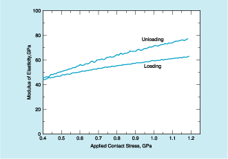 A specimen to be tested by the cylindrical-punch indentation technique is prepared by standard metallographic procedures. The specimen is mounted on a load-versus-displacement-measuring apparatus, which could be any of a variety of indentation-type hardness testers or other conventional mechanical testing instruments. In the indentation test, the flat end of a round cylindrical punch is pushed into the polished, flat surface of the specimen. To minimize impression creep (a time-dependent plastic deformation that could contribute a large error to the modulus data), the specimen is preconditioned by pre-indenting it at a load greater than the load to be applied during the subsequent test. Thereafter, the applied load is varied according to the specification for the test and the punch displacement is measured as a function of the applied load. The modulus of elasticity (for example, see figure) and, if desired, other aspects of the elastic response of the specimen material are computed from the displacement-versus-load data with corrections, if necessary, for the elastic response of the punch and the rest of the testing apparatus.