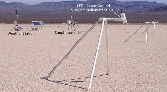 The present ground facility occupies a target site consisting of the Frenchman Flat dry lakebed located north-northeast of Mercury, Nevada. The instrumentation at the facility includes a light-emitting-diode spectrometer (LSpec), which consists of eight tripod-mounted, ground-viewing radiometer units containing LEDs biased to operate as photodetectors (instead of light emitters) at their respective wavelengths. The LSpec provides an essentially continuous stream of measurements at eight discrete wavelengths. These are merged with spectral surface-reflectance measurements made on occasional site visits to obtain temporally continuous coverage with high spectral resolution. Other equipment at the site includes a weather station and a tracking sunphotometer (see figure).