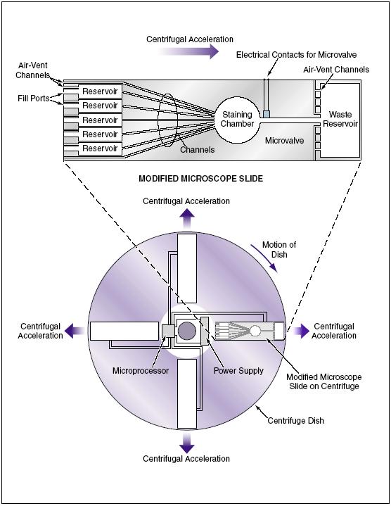The channel from each reservoir to the staining chamber would be made so narrow that the combination of surface tension of the liquid and friction between the liquid and the channel surface would suffice to prevent the flow of liquid from the reservoir to the staining chamber in the absence of hypergravitational centrifugal acceleration below a specified level. Downstream of the staining chamber, there would be channel for draining each fluid from the staining chamber into a waste reservoir after use; this channel would be wider than the other channels so that draining could be accomplished at a centrifuge speed much lower than that needed for filling the staining chamber from a reservoir. Flow in this channel would be restricted by an electrically actuated microvalve controlled by a microprocessor on the spindle of the centrifuge.