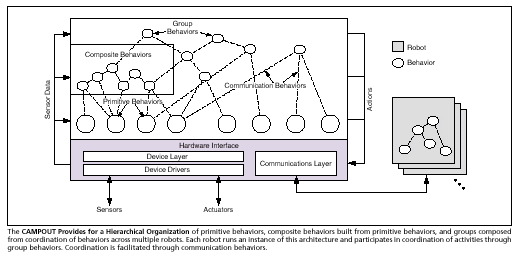 The CAMPOUT provides basic mechanistic concepts for representation and execution of distributed group activities. One considers a network of nodes that comprise behaviors (self-contained controllers) augmented with hyper-links, which are used to exchange information between the nodes to achieve coordinated activities. Group behavior is guided by a scripted plan, which encodes a conditional sequence of single-agent activities. Thus, higher-level functionality is composed by coordination of more basic behaviors under the downward task decomposition of a multi-agent planner (see figure).