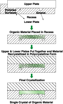 The cell is then placed on a controlled-temperature, heated stage under a polarizing microscope, so that the organic material can be heated and cooled for the final crystallization and the microscope can be used to observe the crystallization process. The temperature of the stage is first increased to the melting point, taking care that except for a single seed crystal of desired orientation, all the organic material is melted. The seed crystal can be singled out under the microscope, and while all other crystals melt, it can be kept solid by exposing it to a microjet of cool air. The temperature of the stage is then slowly decreased, causing the organic material to freeze as a single crystal that grows outward from the seed crystal.