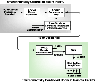 The SFODA and the CSO work in unison in their environmentally controlled rooms to satisfy stringent requirements for stability of frequency and phase: While the SFODA helps to ensure long-term stability, the CSO helps to ensure short-term stability. In this system, the 100-MHz signal is first multiplied to 1 GHz before applying it as modulation to the optical carrier. At the remote site, a low-noise 100-MHz voltage-controlled oscillator (VCO) that is part of the SFODA is phase-locked to the 1-GHz signal to preserve coherence with the frequency standard. In turn, the CSO is phase-locked to the output of the VCO. The cleaned-up signal is then measured and distributed to end users.