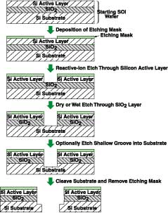 The main steps of the second version of the proposed process are nearly identical, except that one would turn the wafer upside-down and etch through the substrate first. The advantage of the second approach is that one would generate the facets by cleaving the silicon active layer; the quality of the facets would therefore be better than that achievable (by etching) in the first version.