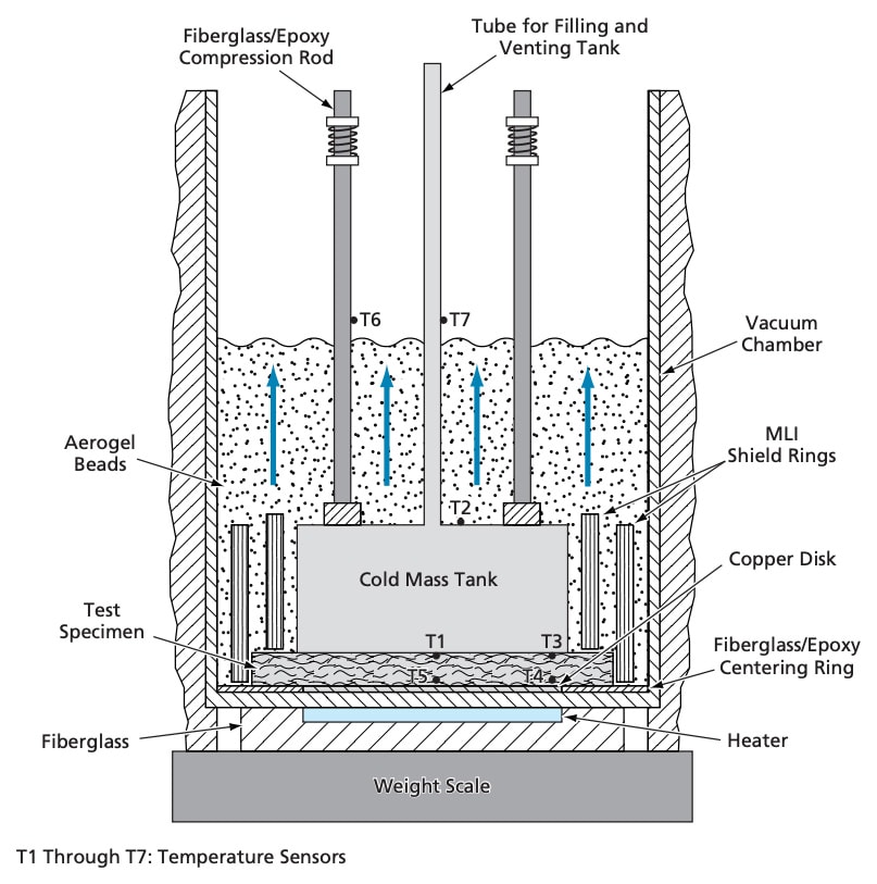 The total heat-leak rate is measured and calculated as the boil-off flow rate multiplied by the latent heat of vaporization. The parasitic heat leak (to the side of the specimen and to the top and side of the cold-mass tank) is reduced to a small fraction of the total heat leak by use of a combination of multilayer-insulation (MLI) shield rings, reflective film, a fiberglass/epoxy centering ring, and a bulk fill of aerogel beads. This combination eliminates the need for a cryogenic guard chamber used in a typical prior apparatus to reduce the parasitic heat leak.