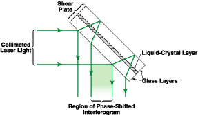 In the liquid-crystal phase-shifting shearing interferometer, collimated light from a laser is incident on a shear plate oriented at an angle of 45° (see figure). Unlike a traditional shear plate, this shear plate contains a liquid-crystal layer that can be used to vary the phase of the light reflected from its rear surface. The amount of shear depends on the effective optical thickness of the shear plate, which is comparable to the combined optical thicknesses of its glass layers. When a voltage is applied across the liquid-crystal layer, the index of refraction of the layer changes, causing the phase of the portion of the incident light reflected from the rear surface to be stepped relative to the phase of this portion when the voltage is not present. Calibration of the phase shift as a function of voltage can produce the phase steps required to implement common phases-stepping algorithms.
