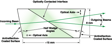 In a typical application, it is required to have one of the outgoing beams undeviated (that is parallel to the incoming beam). To satisfy this requirement, the prisms would be wedged: that is, the entrance and exit faces would not be parallel to each other and, instead, would be slanted by a small angle chosen so that, for one polarization component, the angular deviation caused by refraction at these faces would cancel the angular deviation caused by the birefringence. The angular deviation caused by refraction at these faces would be only slightly dependent on wavelength: that is, the device would be nearly achromatic. By eliminating surfaces orthogonal to the incoming beam, the wedging of the prism would also minimize optical feedback to the laser.
