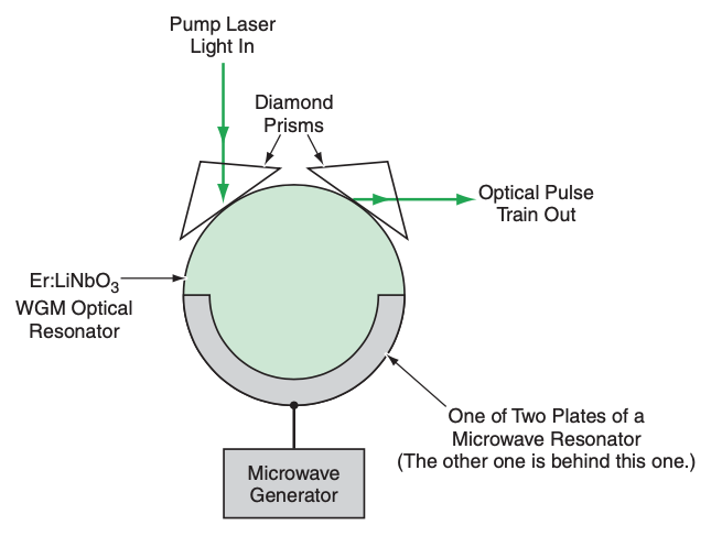Because of the optical/microwave coupling, the device would function as a mode-locked laser in the presence of both CW pump light and CW microwave radiation. The net result of the interaction would be the generation of pulses of light in the WGM optical resonator. Because the optical amplification would not be sensitive to phase, pulses are expected to travel circumferentially around the resonator in both directions. Hence, for example, it should be possible to extract an optical pulse train propagating in the circumferential direction opposite of that of the pump light, as shown in the figure.