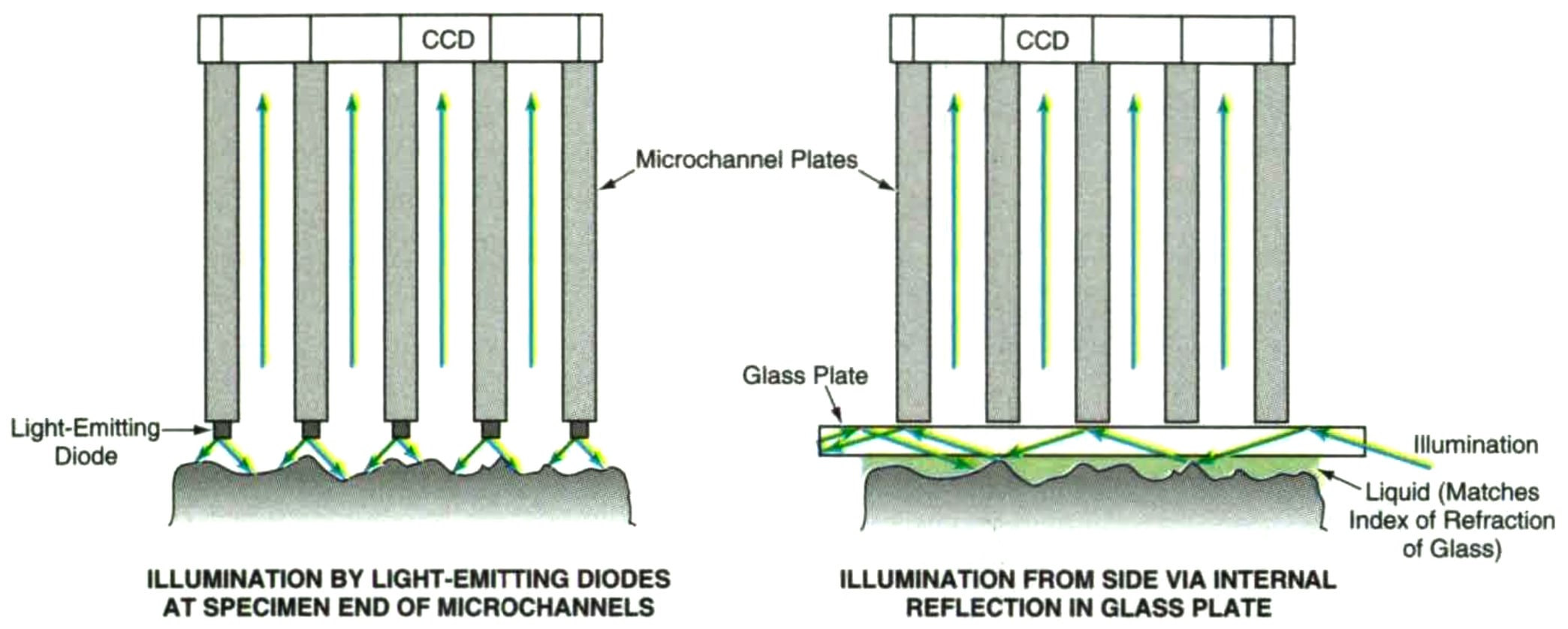 According to the present proposal, the specimen would be illuminated in either of two reflection modes. In one case, the illumination would be provided by microscopic light-emitting diodes mounted on the walls between the microchannels, facing the specimen. In the other case, the specimen would be covered by a glass plate. Illumination would be brought in from the side by total internal reflection in the glass plate. A fluid with an index of refraction equal to that of the glass would be placed between the specimen and the glass plate to couple the illumination onto the specimen. There would be a thin airgap between the glass plate and the microchannel plate. Some of the light scattered and reflected by the specimen would travel along the microchannels to the CCD, as in the other versions of this instrument.