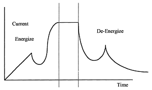 Testing is performed by actuating the valve, recording the data, and having experts evaluate the current signature. The latter is the current-vs.-time waveform exhibited by the valve as it is energized and de-energized (Figure 3). The characteristic waveform is similar for all GH2FCVs, but small tolerance changes in manufacture and other variables make each valve unique and the corresponding waveforms different. The exact curve signature is a function of electrical and mechanical characteristics of the valve as well as many other variables. It is precisely these subtle changes in the curve signature that yield information about the status of the valve. Thus knowledge of the specific valve and its history are needed to make a good assessment.