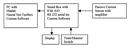 Once an acceptable network has been defined, the structure with weights and bias information is sent to the smart box. At this point the box may be disconnected from the PC and switched to the "monitor" mode. In this mode the box automatically detects activation of the valve, collects data, preprocesses it, feeds this information to the NN, and displays the results.