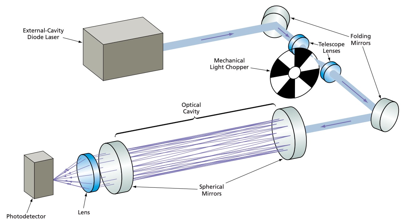 The instrument (see figure) includes an external-cavity diode laser, the output of which is directed by folding mirrors into an optical cavity. Optionally, the electromagnetic modes of the laser and the cavity can be matched by use of two telescope lenses. Also, optionally, the laser beam can be chopped for (CRDS) or not chopped (for ICOS). The optical cavity is bounded by two identical mirrors, typically having a diameter of 25 mm and a radius of curvature of 6 m (and, hence, a focal length of 3 m). Typically, the mirrors are longitudinally separated by a distance of 67 cm. Preferably, the mirrors both have reflectivities >0.99, though reflectivities as low as 0.5 could be acceptable in some applications.