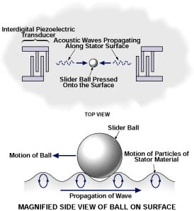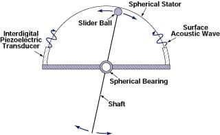 The primary innovation of the USAM lies in its ability to operate with multiple degrees of freedom simultaneously, combining both linear and rotary movements. This is achieved through the use of surface acoustic wave transducers that generate traveling waves along curved stator surfaces. A slider ball, positioned on these surfaces, is actuated by the waves, allowing for precise control through a connected shaft. The design enables the motor to be compact and integral to the actuated structure, which is particularly beneficial for robotic joints and high-precision applications.