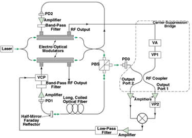The carrier-suppression bridge functions as follows: The reflected light in the long oscillator loop is further reflected by the PBS and thereby made to enter a photodiode (PD3), which detects RF amplitude modulation of the light. Another RF signal is obtained from the RF output port of the short oscillator loop, then processed through a variable attenuator (VA) and variable phase shifter (VP1), then made to interfere with the RF output of PD3. The VA and VP1 are adjusted so that output port 1 of the bridge passes minimum power while output port 2 of the bridge passes maximum power.