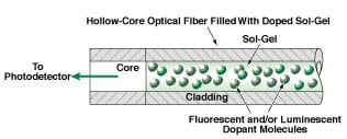 If the dopant(s) could be incorporated into the core, the optical coupling would be much stronger and the sensory light could propagate to the detection equipment with very little loss. In addition, given the limit of solubility of the dopants in the sol-gel reaction mixture and the wave-propagation geometry, the optically effective quantity of dopant that could be contained in the bulk of the core would be much greater than the optically effective quantity of dopant that can be contained in an exterior sol-gel sensory film. The net effect of incorporating the dopant into the core would be to make the sensor much more sensitive. The present method exploits this effect.