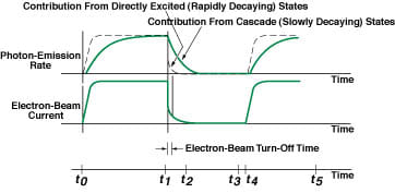 The electron beam is pulsed on and off (see figure) by applying a rectangular potential waveform to one of the accelerating electrodes in the electron gun. Starting at the beginning of the pulse cycle (time t0), the electron-beam current increases rapidly from zero to a stable "on" value (typically to ≈200 μA within a time of 150 ns). The gun is maintained in the "on" state for a time sufficient to obtain dynamic equilibrium between excitation and de-excitation processes of the specific excited state that one seeks to analyze. At time t1, the electron beam is switched off and the electron-beam current falls to zero within ≈30 ns.