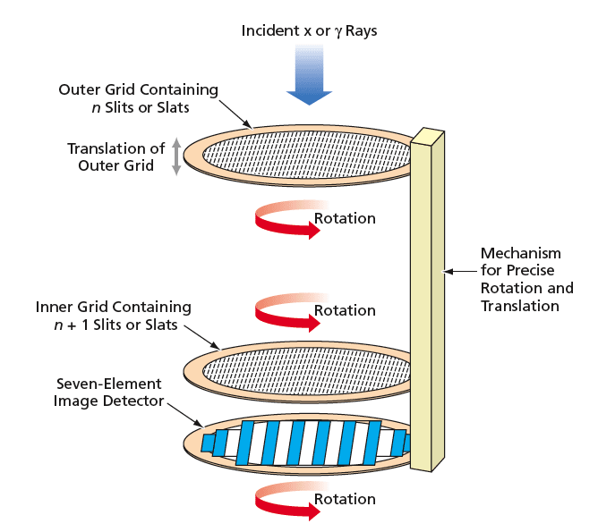 Both grids would have the same overall width. If n were the number of slits or slats in one of the grids, then the other grid must contain n + 1 slits, respectively. Because both grids would have the same overall width, the width of an individual slit or slat would be slightly greater in the n grid than in the n + 1 grid. It would not matter which grid was characterized by the greater number; for the initial design, n and n + 1 would be chosen for the outer and inner grid, respectively. The image detector could be composed of as few as two elements; however, prior research has shown that seven elements would represent a better compromise between the quality of image data and the complexity of the hardware.