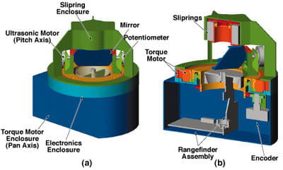 Key features of the assembly include its small size, measuring approximately 1.4 inches high and 2 inches wide, which allows for efficient integration into robotic systems. The design employs a through-bore motor as the pan actuator, which not only saves space by housing part of the laser circuitry within the motor but also enables continuous pan motion and high-resolution angular positioning. This direct-drive mechanism eliminates the need for a gear train, reducing mass and volume while improving reliability.