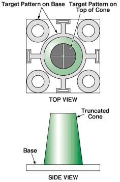 The technique has been used to mark anodized aluminum docking targets shaped as truncated cones on square bases (see figure). In this application, there is a need for some additional process steps (beyond the basic steps described above): It is necessary to measure the anodized aluminum workpiece to determine the heights of the target pattern surfaces for proper adjustment of the laser. The corrected target-pattern drawing file generated as described above is used to generate three additional files: one for the perimeter of the base, one for the target pattern on the base, and one for the target pattern on top of the truncated cone. The base-perimeter file is used to laser cut a hole in a sheet of poly(methyl methacrylate) or other suitable material on the laser work table; this hole is used to position the workpiece. The other two files are used to control the laser on the base and top surfaces, respectively.