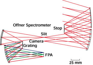 Distortion increases as the cube of the spectral length, so it becomes increasingly difficult to maintain performance across large-area FPAs. The new designs use several variations of Offner configurations to maintain high performance across large areas. In the design shown in the figure, the image is 16 mm long and the spectrum is 12 mm long, yet the spectral distortion is less than 1 percent of a pixel. This is accomplished by tilting the two relay mirrors of a lateral Offner configuration (the grating and FPA are displaced laterally from the slit line).