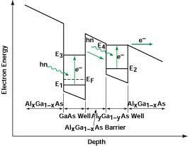 The ground state of the left quantum well would be doped up to Fermi level EF, which would be below E2. Electrons in the E1 level would become excited to the E3 level by absorbing photons. The stated engineered relationships among the energy levels at the threshold electric field would give rise to resonance between (1) the transition from E3 to E2 and (2) the optical phonon without (3) transfer of momentum. Consequently, an electron that had been photoexcited from E1 to E3would make a rapid transition (within a typical quantum-state lifetime of the order of a picosecond) from E3 to E2. Repeated such excitations and transitions would cause the ground (E2) state of the right potential well to become populated.