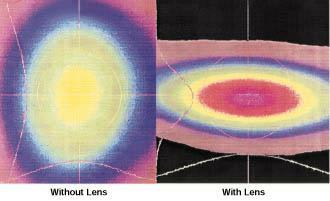 Experimental results indicate that this method achieves only a 3% insertion loss when the cylindrical lens is used, significantly better than the losses associated with traditional methods. The document includes figures illustrating the beam profiles of light emerging from the fiber with and without the cylindrical lens, demonstrating the effectiveness of the approach in altering the aspect ratio from 0.8:1 to 2.9:1.