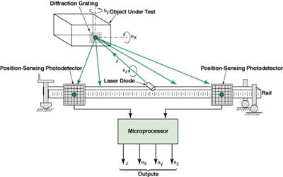 The prototype of the system (see figure) includes (1) a reflective diffraction grating mounted on the object under test; (2) a collimated laser diode fixed in a known position and orientation on, and relative to, a dimensionally stable rail; and (3) at least two position-sensing photodetectors mounted at known positions and orientations on the rail. In an alternative version, the laser diode could be affixed to the object under test.