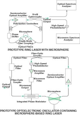 In the prototype ring laser, there is no need for feedback control of laser frequency because the microsphere is an integral part of the laser. The prototype ring laser (shown in the upper part of Figure 2) includes a high-purity silica microsphere and a semiconductor optical amplifier plus ancillary optical components connected in an optical loop. One of the components in the loop is an optocoupler for sampling the laser beam.