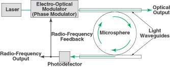 In the OEO shown in the figure, the microsphere would be incorporated into the oscillator feedback loop via evanescent-wave coupling with optical waveguides. In one operational scenario, light from the output of a phase modulator would be coupled into the microsphere to excite two modes, corresponding to a carrier signal and a sideband; it would be possible to do this because deviations from perfect sphericity would create modes with a frequency difference falling in the microwave range. The beat note between the two modes would appear at the output of the photodetector and would constitute the desired microwave signal. Some of the beat-note power would be fed back to the modulator to sustain the oscillation.