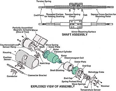 Figure 2 depicts the components of the mechanism. The mirror is mounted on an arm that extends radially outward from an aluminum shaft. A tantalum counterweight mounted on the shaft opposite the mirror minimizes the offset of the center of gravity of the shaft, thereby minimizing moments that could be affected by gravitation, acceleration, and vibration. The shaft is supported by bushings that allow free rotation. The bushings fit into holes in end caps. The mating surfaces in the end caps are anodized and impregnated with poly(tetrafluoroethylene) to minimize friction. The shaft is machined to provide a central hollow that accommodates a beryllium copper wire, which serves as a torsion spring to bias the mirror in the open position.