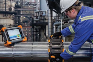 Eddyfi Technologies, Quebec, Canada, offers a standard pulsed eddy current array (PECA) probe for corrosion under insulation (CUI) and corrosion under fireproofing (CUF) inspections. The probe offers relative wall thickness measurements, and penetrates the entire thickness of components under test, detecting internal and external corrosion. The 6-element PECA probe is capable of single-pass coverage of 457 mm (18”) in grid or high-resolution, dynamic mode. The probe's integrated locking mechanism enables it to adapt to outer diameters 152 mm (6”), all the way up to flat surfaces, and spring-loaded wheels ensure smooth acquisitions over buckles and uneven surfaces.
