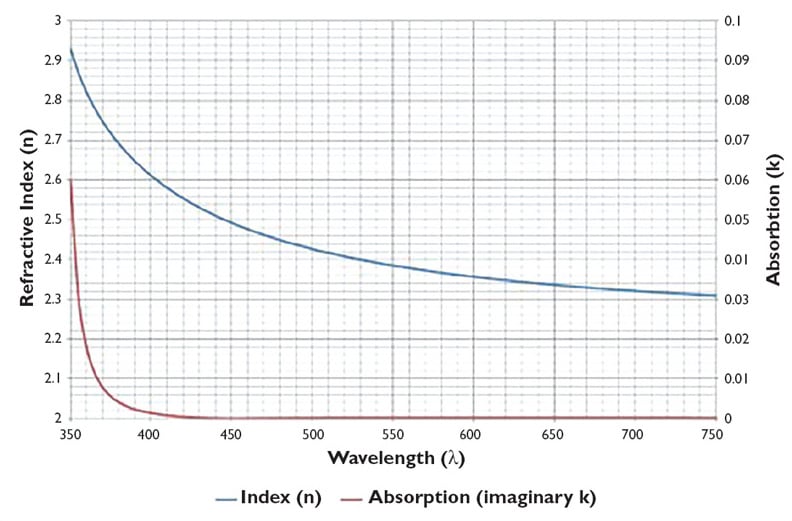 The key coating material properties are: refractive index, absorption coefficient, stress coefficient, and durability. Design software is used to control the performance of the coating, allowing the material to be efficiently used. Figure 3 shows how the refractive index and absorption typically change by wavelength; this also depends on the nature of the deposition process.