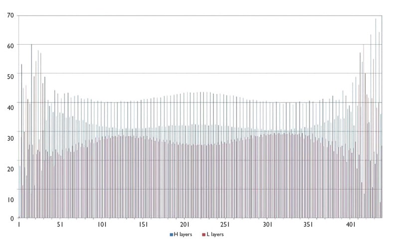 Figure 2 shows the layer structure of this multilayer alternating refractive index design of around 500 layers with thicknesses varying from 5-70 nm.