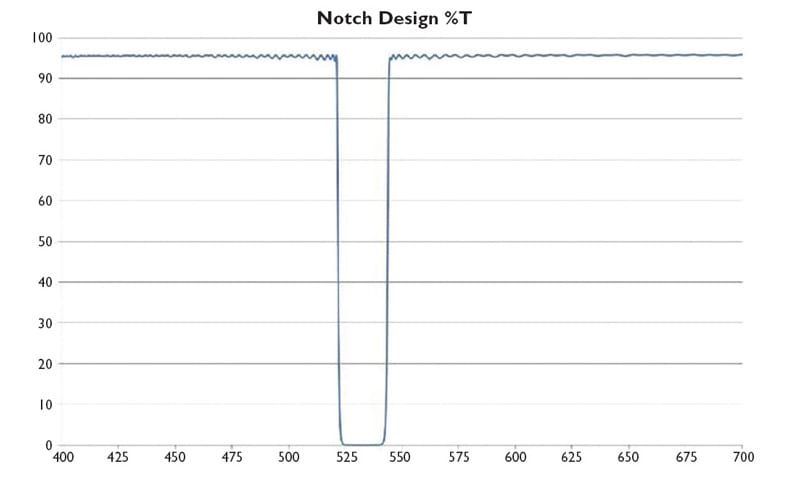 Figure 1 shows the response of a high-performance filter designed to block a 532 nm (green) laser while transmitting other visible light.